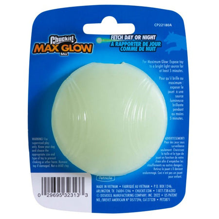 The Chuckit!® Max Glow® Ball gives dogs something to jump for. This durable rubber ball glows in the dark to allow the game to keep going when the sun goes down. It charges quickly under any bright light taking just five minutes to generate 20 to 30 minutes of glowing playtime (no batteries or cords needed). Easy to clean and dogs will love this textured grip-able rubber ball made just the right size to use perfectly with the Medium Chuckit! Sport Launcher (sold separately).PRODUCT NOTE: We recommend that dogs are supervised during playtime and remove the toy from the dog if it becomes damaged or parts become separated. Discontinue use if the toy is damaged. No dog toy is indestructible; and every dog interacts with its toys differently. Supervised play will go a long way toward helping toys last longer.