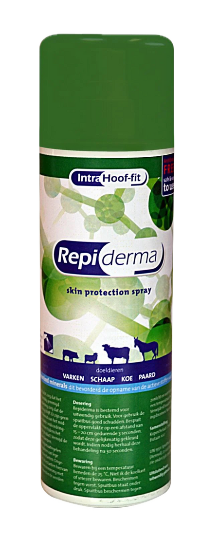 Repiderma spray is an antibiotic-free, micronized mineral aerosol for livestock (cattle, sheep, pigs, horses) that protects and promotes healing for skin and hoof issues like digital dermatitis, foot rot, and udder cleft dermatitis, forming a breathable, water-resistant barrier with copper and zinc chelates for up to three days. It's safe, easy to apply (even upside down), and supports natural recovery without antibiotics, making it a popular choice for general skincare and post-dehorning care on farms.