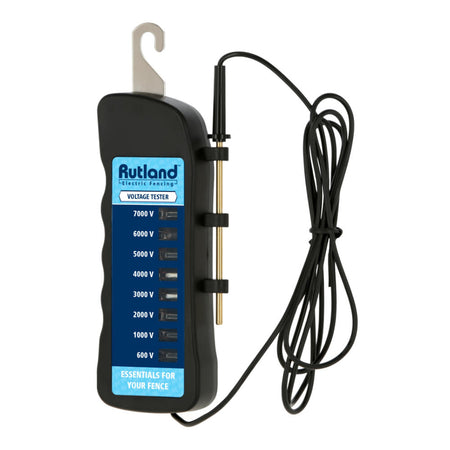 The Rutland 8 light fence tester displays the voltage in eight stages for precise fence measurement. It includes a ground spike and can read voltages between 600 V and 7000 V. This is a quick and easy way to check what voltage your fence is giving out.