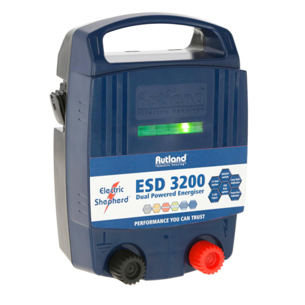 The Rutland ESD 3200 is a powerful dual power fence device for Temporary/Permanent fencing solutions, designed for normal fences and light vegetation. It has high output with a fence monitoring indicator and a separate battery indicator, and comes with an On/Off switch. It has the latest electric fencing technology - microprocessor controlled, and has optimised power consumption thanks to an energy-saving mode. It comes with deep discharge protection with 12V operation and is certified to European standards.