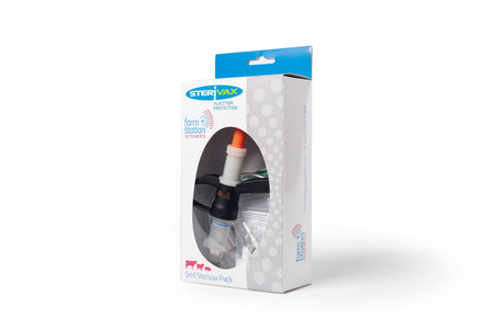 The Sterivax pack contains: 5ml semi-disposable vaccinator, draw off system, 1 x Sterimatic Sleeve, 3 x Stericaps and 3 x 18g x 1” needles.